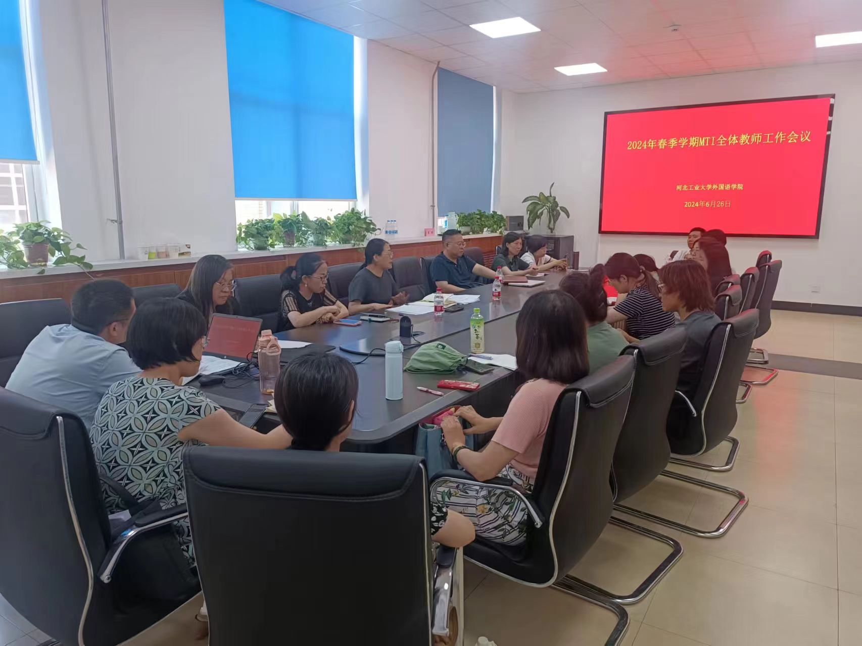 为进一步提升我院翻译硕士教育教学质量,总结本学期教学情况,确保2024年秋季学期教育教学工作顺利开展,6月26日上午,外国语学院在201会议室召开2024年春季学期MTI教学工作会议,会议由外国语学院院长兼MTI教育中心主任石梅芳主持,中心副主任都帅、研究生指导教师、授课教师参加了会议。