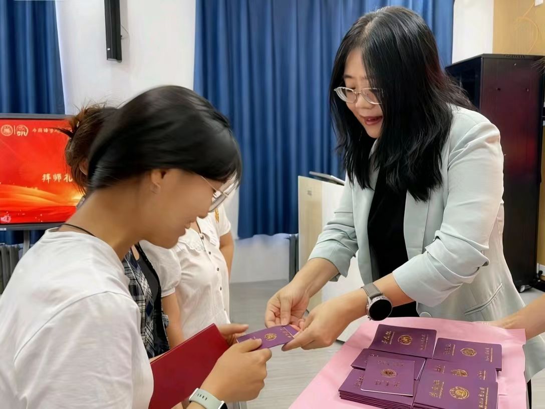 在2024级研究生贠正军、2025级研究生庞月贝活泼又不失隆重的主持下,41名2025级新生对导师行拜师礼。10名研究生导师逐一上台接受拜师礼:学生鞠躬呈递“拜师贴”,敬献束脩之礼、鲜花;导师递送“回徒贴”,并为学生颁发学生证,让新生在感受传统礼仪文化的同时,也潜移默化地传承了尊师重道的传统美德。