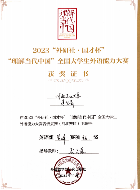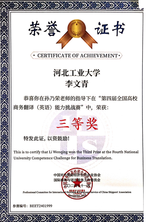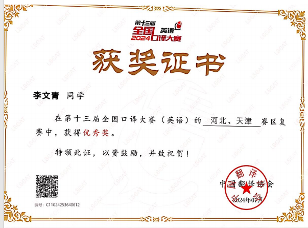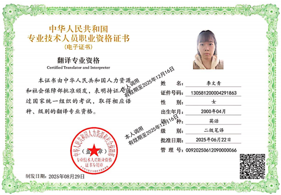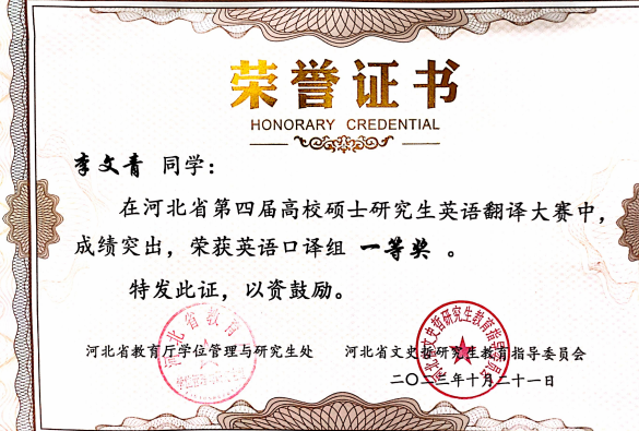 专业资质认证方面,她成功考取 CATTI 二级笔译证书,为专业发展筑牢根基;学术研究上,她以第一作者身份在《今古文创》期刊发表论文,将理论思考与实践探索融为一体,展现出良好的学术素养。学科竞赛中,她更是屡创佳绩:斩获中西部翻译大赛全国一等奖、《英语世界》杯翻译大赛全国二等奖、全国高校商务翻译(英语)能力挑战赛全国三等奖,还在全国口译大赛中荣获全国优秀奖;省级赛事中,先后拿下 2024 年河北省研究生翻译大赛相关奖项、2025 年河北省研究生翻译大赛奖项,以及 2024 年、2025 年大学生英语竞赛相关荣誉,此外在 “外研社・��������国才杯” 外语能力大赛中也有所斩获,以赛促学、以赛提能,持续拓宽专业视野与综合素养。