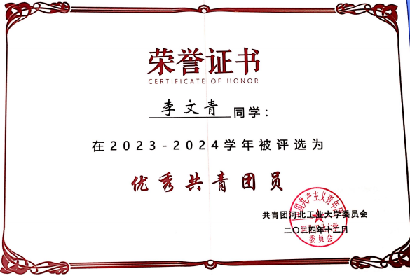 李文青,女,中共党员,外国语学院英语笔译 S23Z2265 班研究生(学号:202332201008),现任校院研会文体部干事。自 2023 年 8 月入学以来,她始终以河北工业大学 “勤慎公忠” 的校训为精神指引,践行外国语学院 “外内兼修 语通天下” 的院训理念,在学业深耕、竞赛突破、学术探索、实践服务等方面稳步前行,用扎实的积累与亮眼的成绩,勾勒出新时代研究生全面发展的鲜活图景。