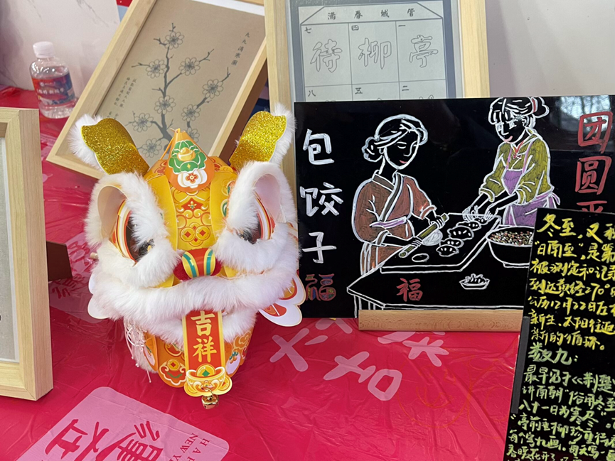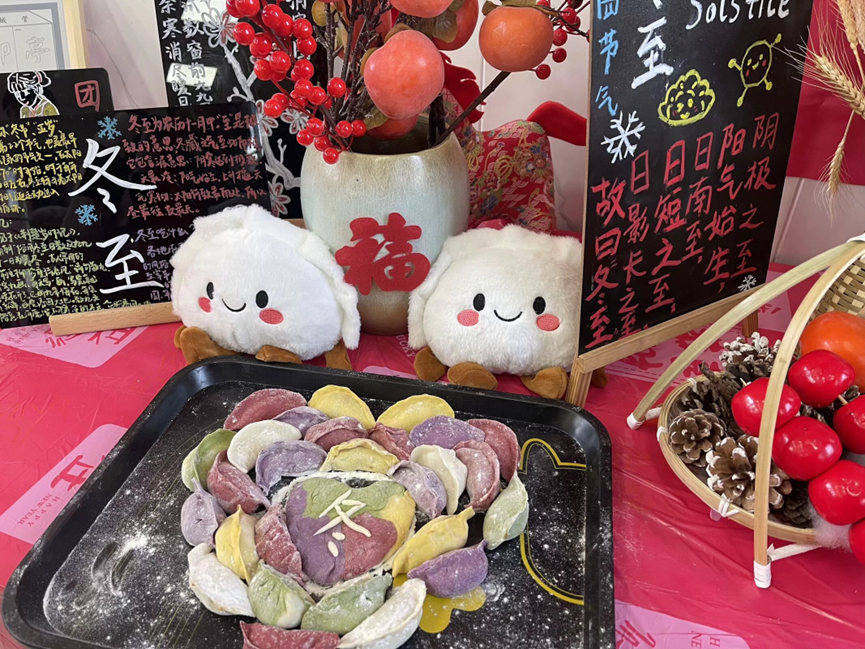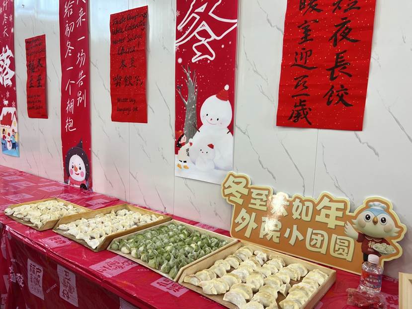活动现场的文化布置颇具匠心,既彰显党建底色,又融入专业特色。“冬至已至,春归有期”等中英文谚语书法作品整齐陈列,“九九消寒图”传统文化展板等布景温馨醒目。师生党员在体验民俗的过程中,深入感悟中华优秀传统文化的深厚底蕴,纷纷表示要以专业所长讲好中国节日故事,坚定文化自信,这也让主题党日的“党味”更浓、“文化味”更厚。