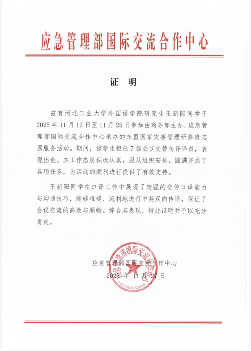 11月25日,由商务部主办、应急管理部国际交流合作中心承办的“东盟国家灾难管理研修班”和“太平洋岛国气候变化与灾害风险管理研修班”在北京圆满落幕。我院S25Z2270班研究生王新阳、英语231班刘增亮两名同学在为期2周的援外培训中圆满完成了陪同翻译与服务管理工作,展现了扎实的语言功底与出色的跨文化服务能力,学院收到应急管理部国际交流合作中心感谢信。