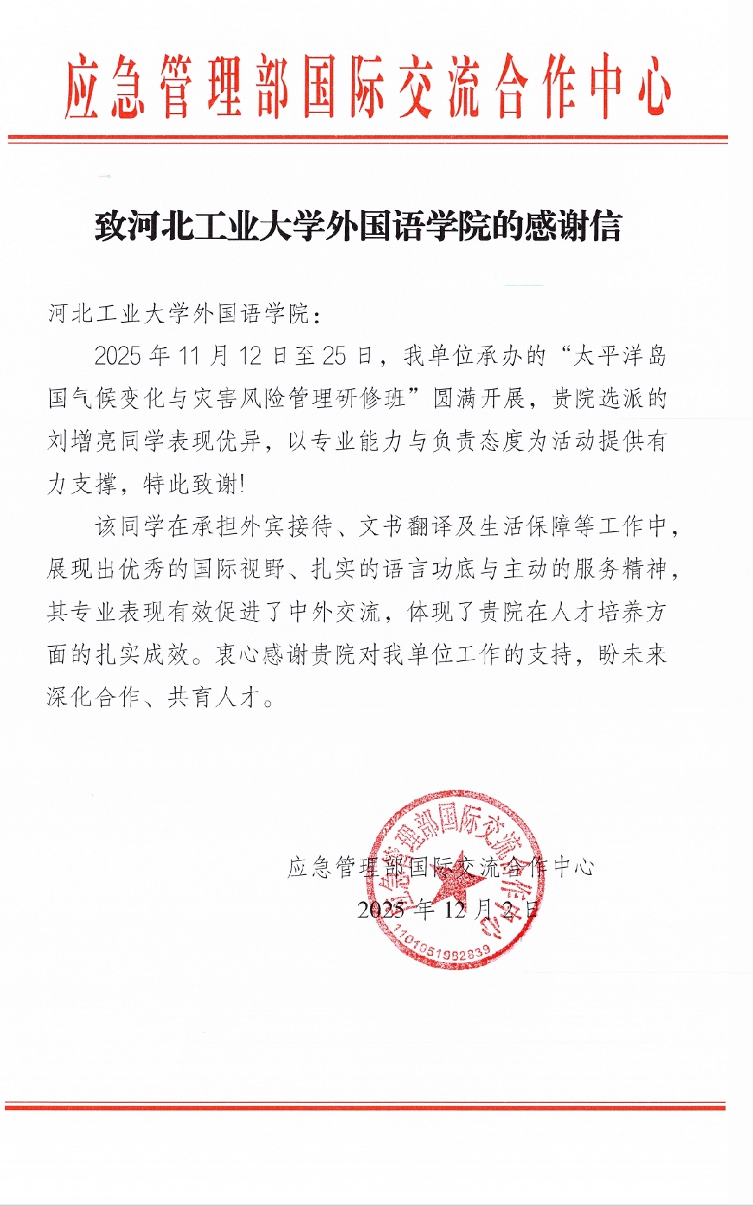 本次援外培训项目取得了圆满成功,应急管理部国际交流合作中心特向我院发来感谢信,对王新阳、刘增亮两位同学的专业贡献与积极态度表示充分肯定,并对学院的人才培养工作致以谢意。