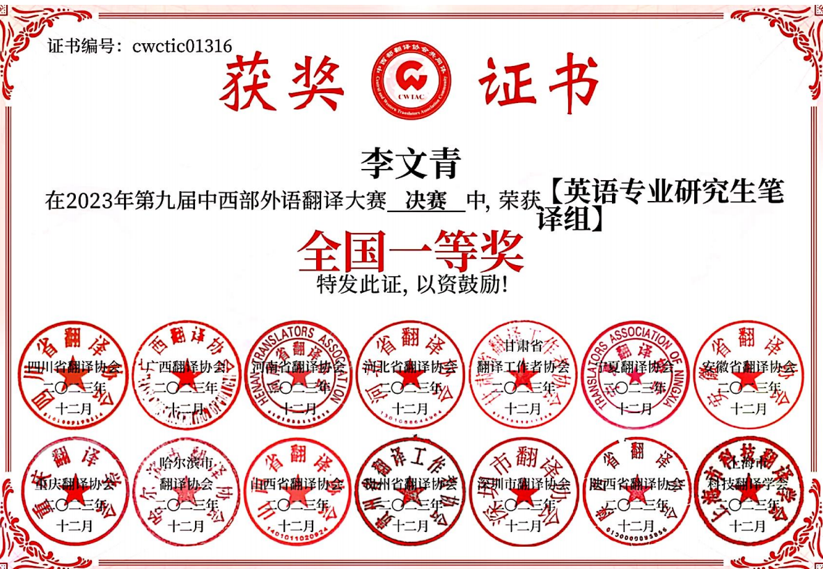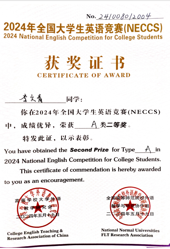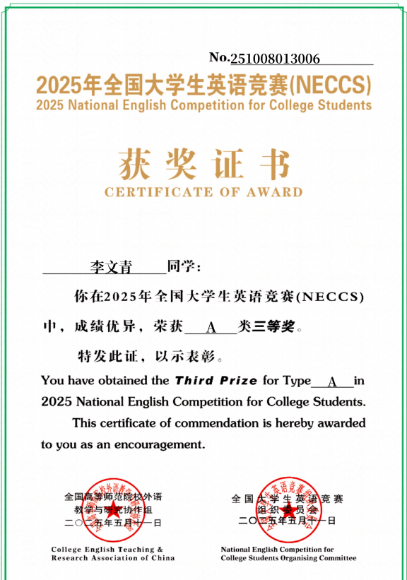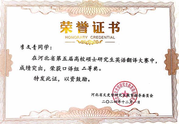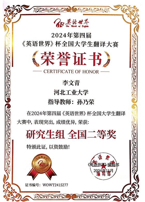 专业资质认证方面,她成功考取 CATTI 二级笔译证书,为专业发展筑牢根基;学术研究上,她以第一作者身份在《今古文创》期刊发表论文,将理论思考与实践探索融为一体,展现出良好的学术素养。学科竞赛中,她更是屡创佳绩:斩获中西部翻译大赛全国一等奖、《英语世界》杯翻译大赛全国二等奖、全国高校商务翻译(英语)能力挑战赛全国三等奖,还在全国口译大赛中荣获全国优秀奖;省级赛事中,先后拿下 2024 年河北省研究生翻译大赛相关奖项、2025 年河北省研究生翻译大赛奖项,以及 2024 年、2025 年大学生英语竞赛相关荣誉,此外在 “外研社・��������国才杯” 外语能力大赛中也有所斩获,以赛促学、以赛提能,持续拓宽专业视野与综合素养。