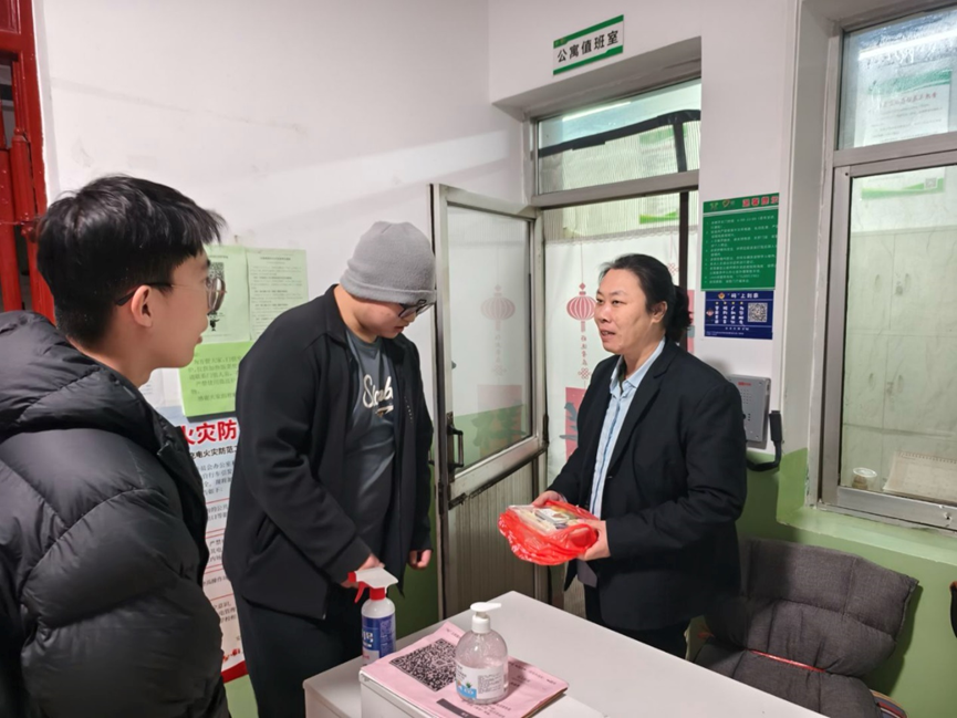 此外,学院党委专门组建党员志愿服务队,带着刚煮好的饺子,先后走访了学校门卫室、学生宿舍楼、学院办公楼等一线岗位,为无法回家过节的值守人员送上节日问候,用实际行动践行党员的服务宗旨,传递党组织的温暖。